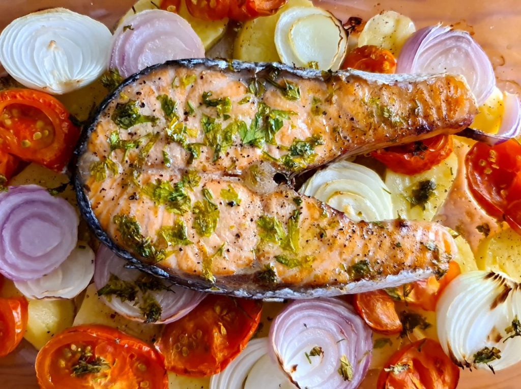 -Pasados unos 15-20 minutos añadimos el salmón y el perejil a la bandeja del horno y horneamos aproximadamente unos 15 minutos más hasta que esté hecho el salmón y listo ✅